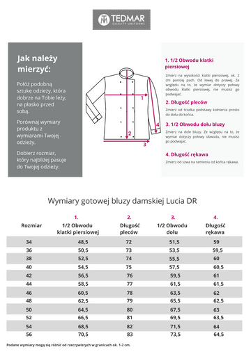 100% bawełna. 200 g/m². Pranie 95°. Łatwa w pielęgnacji damska bluza kucharska z długimi rękawami, zapięciem na zatrzaski i kieszenią na piersi. Sanforyzowana, dzięki czemu nie kurczy się. Dostępna również w wersji z krótkim rękawem. Prosty krój. Długość pleców: 73 cm w rozmiarze 36