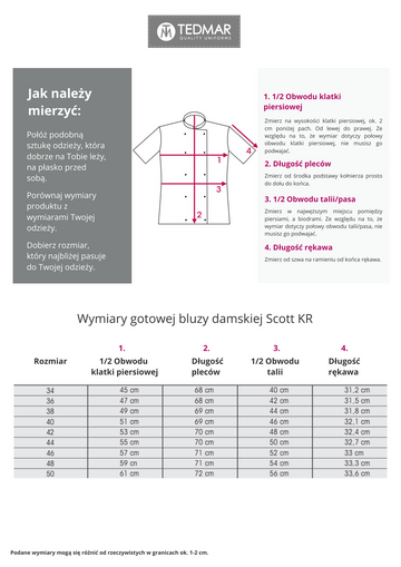 Stylowa damska bluza kucharska wykonana z łatwej w pielęgnacji tkaniny chambray z krótkimi rękawami. Zapięcie na napy, dwuczęściowa kieszeń na lewym ramieniu, szlufka na fartuch przy szyi i rozcięcia po bokach zapewniające swobodę ruchów. Dostępna również z długim rękawem. Lekko dopasowany krój i maksymalny komfort. Tkanina 60% bawełny, 40% poliestru. Gramatura 170 g/m². Prać w temperaturze 60°. Długość pleców: 68 cm w rozmiarze 36