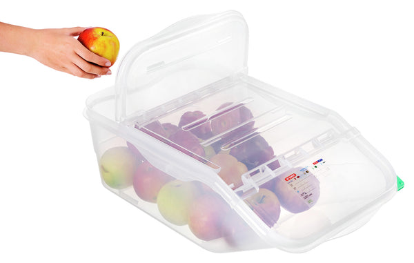 Uniwersalny pojemnik GN 2/3 oparty na systemie FIFO (pierwsze weszło, pierwsze wyszło). Idealny do przechowywania produktów suchych, orzechów, makaronu, ryżu i wielu innych. Wszystkie pokrywy pojemników można otwierać również po ułożeniu w stos. Odpowiedni dla HACCP dzięki kolorowym klipsom. Okno podglądu z etykietą do wpisania z przodu. Można myć w zmywarce.
