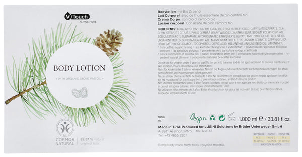 Rewitalizujący, odżywczy balsam do ciała V-Touch Alpine Pure. Certyfikowane kosmetyki naturalne z gwarantowanym prawdziwym organicznym olejem ze szwajcarskiej sosny z certyfikowanych upraw ekologicznych. Balsam do ciała o aromatycznym, drzewnym zapachu szwajcarskiej sosny działa odżywczo, regenerująco na ciało i duszę, stymulując krążenie krwi. Nałożyć cienką warstwę na skórę po prysznicu lub kąpieli. Odpowiedni dla wszystkich rodzajów skóry. Testowany dermatologicznie i o neutralnym pH! Butelka uzupełniająca jest wykonana w 100% z materiałów pochodzących z recyklingu. Zawartość: 1000 ml z zakrętką.