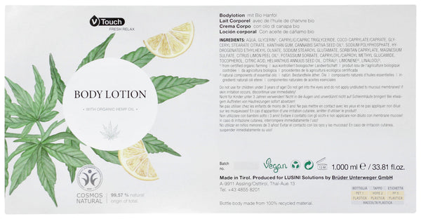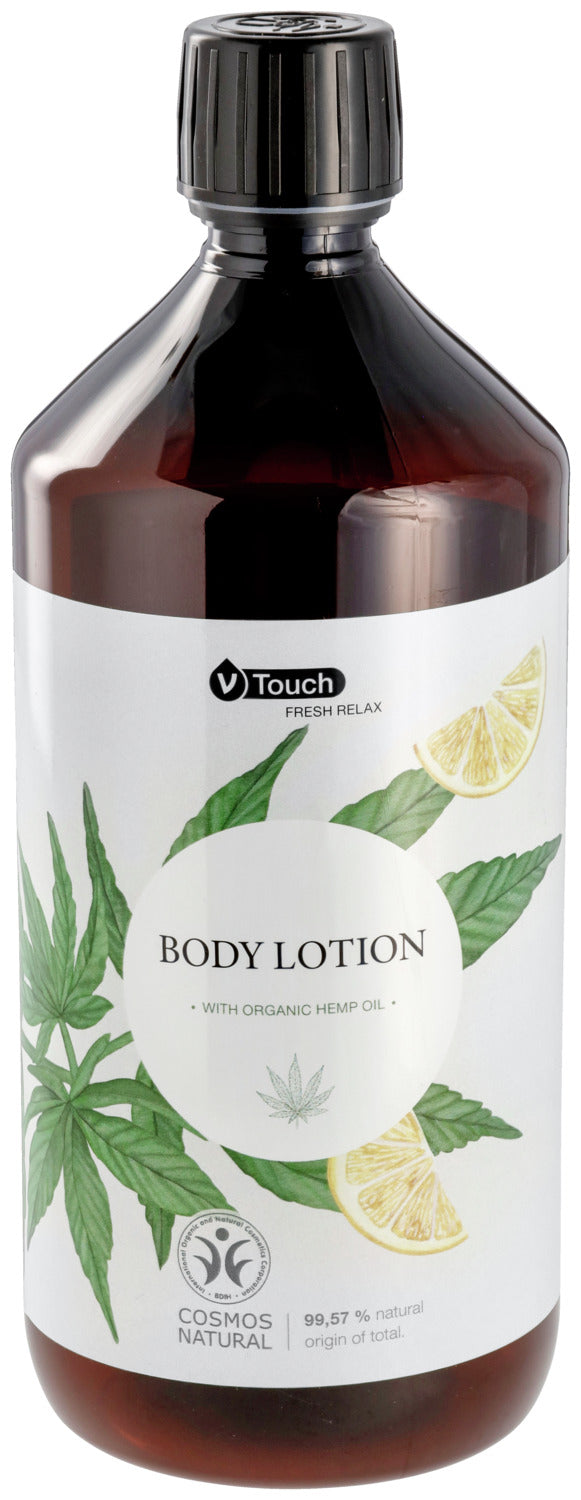 Nawilżający i szybko wchłaniający się balsam do ciała V-Touch Fresh Relax. Certyfikowane kosmetyki naturalne z gwarantowanym prawdziwym olejem konopnym i nutą olejku cytrynowego dla świeżego zapachu. Specjalna kompozycja oleju konopnego (Cannabis sativa) z wieloma wielonienasyconymi kwasami tłuszczowymi intensywnie odżywia. Konopie łagodzą skórę, dostarczają jej cennych składników odżywczych i zapewniają przyjemne uczucie dobrego samopoczucia. Intensywnie pielęgnuje suchą i zestresowaną skórę oraz zapewnia przyjemne uczucie komfortu. Odpowiedni dla wszystkich rodzajów skóry. Testowany dermatologicznie i neutralny pod względem pH! Butelka uzupełniająca jest wykonana w 100% z materiałów pochodzących z recyklingu. Zawartość: 1000 ml z zakrętką.