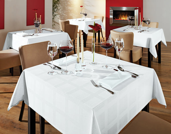 100% bawełna. Gramatura ok. 150 g/m². Klasyczna tkanina żakardowa z subtelnym wzorem w kratkę. Można gotować i chlorować. Wyjątkowo łatwa w pielęgnacji i wytrzymała. Możliwość personalizacji. Bielizna stołowa szyta na zamówienie dostępna na życzenie. Maksymalna długość belki wynosi 30 metrów i można ją przyciąć do żądanego rozmiaru.