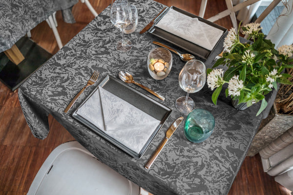100% poliester. Gramatura ok. 165 g/m². Elegancka bielizna stołowa o marmurkowym wyglądzie i jedwabistym połysku. Trwały kolor, wytrzymały i odporny na zużycie. Maksymalna długość belki wynosi 30 metrów i można ją przyciąć do żądanego rozmiaru.