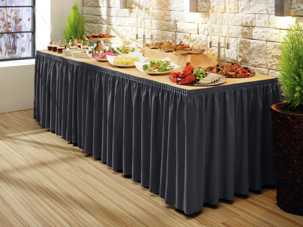 100% poliester. Gramatura ok. 200 g/m². Skirting na metry w wybranym rozmiarze, wykończony specjalnym szwem. Długość można dostosować za pomocą klipsów zakładkowych. Materiał mocujący, klipsy i skirting dostępne osobno. Dostarczane na wieszakach do przechowywania bez zagnieceń. Szczególnie szybkoschnąca i niewymagająca prasowania tkanina.