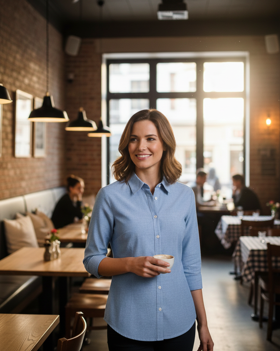 Ponadczasowa bluzka damska o dopasowanym kroju z rękawem o długości 3/4 i mankietem. Dostępna w kolorze niebieskim i antracytowym. Skład: 100% bawełna Gramatura: 95 g/m² Pranie w 60°C