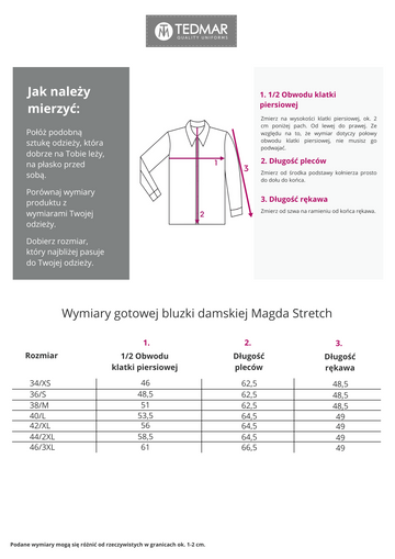 Bluzka damska z elastycznej tkaniny z przewagą bawełny. Dzięki optymalnej gramaturze i mieszance włókien bluzka jest łatwa w pielęgnacji, elastyczna i mało się gniecie. Delikatnie usztywniona stójka oraz kryte zapięcie zapewniają elegancki i nienaganny wygląd. Dłuższy tył gwarantuje wygodę podczas wykonywania obowiązków, ponieważ bluzka nie wysuwa się ze spodni czy spódnicy.