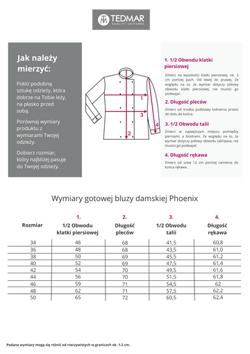 Elegancka damska bluza kucharska wykonana z wyjątkowo lekkiego, oddychającego materiału. Posiada stójkę, kryte zapięcie, wewnętrzną kieszeń na piersi, 2-częściową kieszeń na ramieniu i praktyczną szlufkę do przypięcia fartucha. Boczne panele oraz całe rękawy wykonane są z elastycznego materiału piqué, który jest niezwykle oddychający i zapewnia optymalne dopasowanie. Rękawy posiadają także elastyczne, klasyczne mankiety z zapięciem i rozcięciem. Lekko dopasowany krój. Długość tyłu: 68 cm w rozmiarze 36. Skład: 65% poliester, 35% bawełna Gramatura: 150 g/m² Pranie: 60°C
