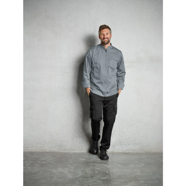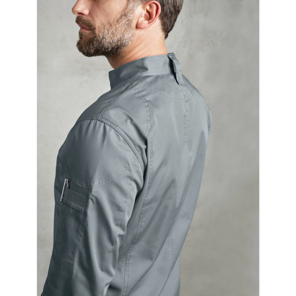 Sportowa, lekka męska bluza kucharska. Wykończona sportowymi podwójnymi szwami, z karczkiem w stylu kurtki motocyklowej. Oddychające, nieprzezroczyste panele z siatki z elastycznymi bokami zapewniają wygodne dopasowanie. Bluza posiada centralny zamek błyskawiczny, stójkę, kieszeń piersiową, dwuczęściową kieszeń na ramieniu i szlufkę do fartucha na karczku. Długie rękawy z klasycznymi mankietami można łatwo podwinąć. Lekko dopasowany krój. Długość tyłu: 76 cm w rozmiarze 50. Skład: 65% poliester, 35% bawełna Gramatura: 150 g/m² Pranie: 60°C