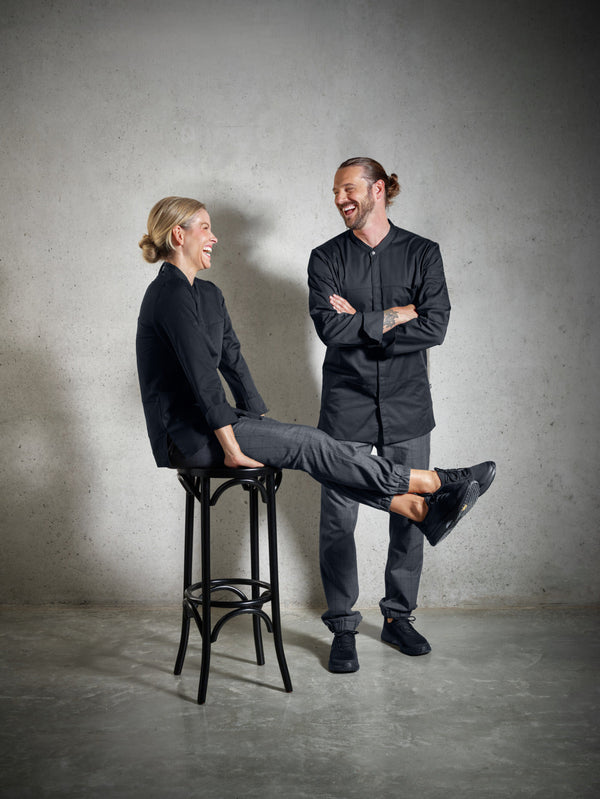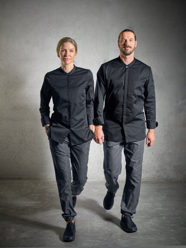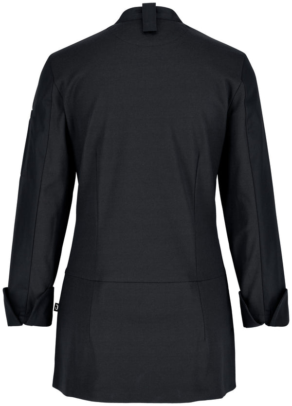 Elegancka bluza damska dla kucharzy, kelnerów, pracowników obsługi, baru i hotelu, wykonana z wyjątkowo lekkiego i oddychającego materiału. Z płaską, wąską stójką, zapięciem na zatrzaski na środku i dwuczęściową kieszenią na ramieniu. Z wpuszczaną kieszenią na piersi, dwiema kolejnymi praktycznymi kieszeniami u dołu i pętelką na fartuch z tyłu szyi. Rękawy zakończone klasycznym, wywijanym mankietem. Cała tylna część, a także pachy, wykonane z oddychającego i elastycznego materiału piqué, który zapewnia smukłe i niezwykle wygodne dopasowanie. Lekko dopasowany krój. Długość pleców: 72 cm w rozmiarze 36. 65% poliester, 35% bawełna. 150 g/m². Pranie w 60°