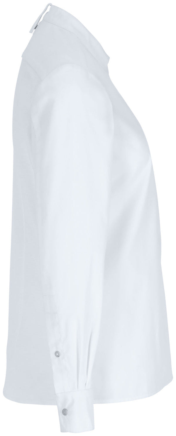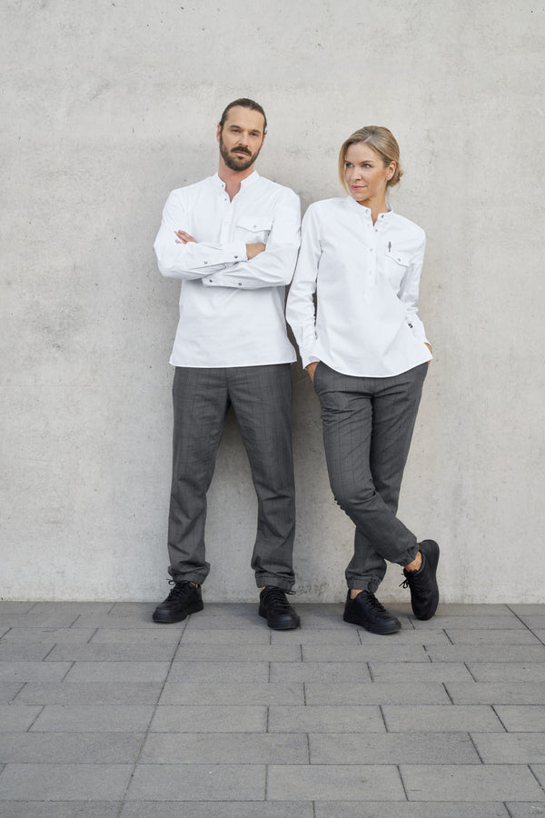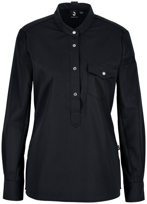 Elegancka damska koszula wykonana z wyjątkowo lekkiego i oddychającego materiału. Szczególnie łatwa do zakładania dzięki bardzo głębokiemu zapięciu na zatrzaski z małą stójką, a także elastycznym plecom i dolnym częściom rękawów z nieprzezroczystego materiału piqué. Z naszywaną kieszenią na piersi, bocznymi rozcięciami na dole i praktyczną pętelką na fartuch przy szyi. Rękawy są wykończone klasycznym mankietem koszuli z zatrzaskami. Prosty krój. Długość pleców: 68 cm w rozmiarze 36. Tkanina 65% poliester, 35% bawełna. 150 g/m². Pranie w 60°