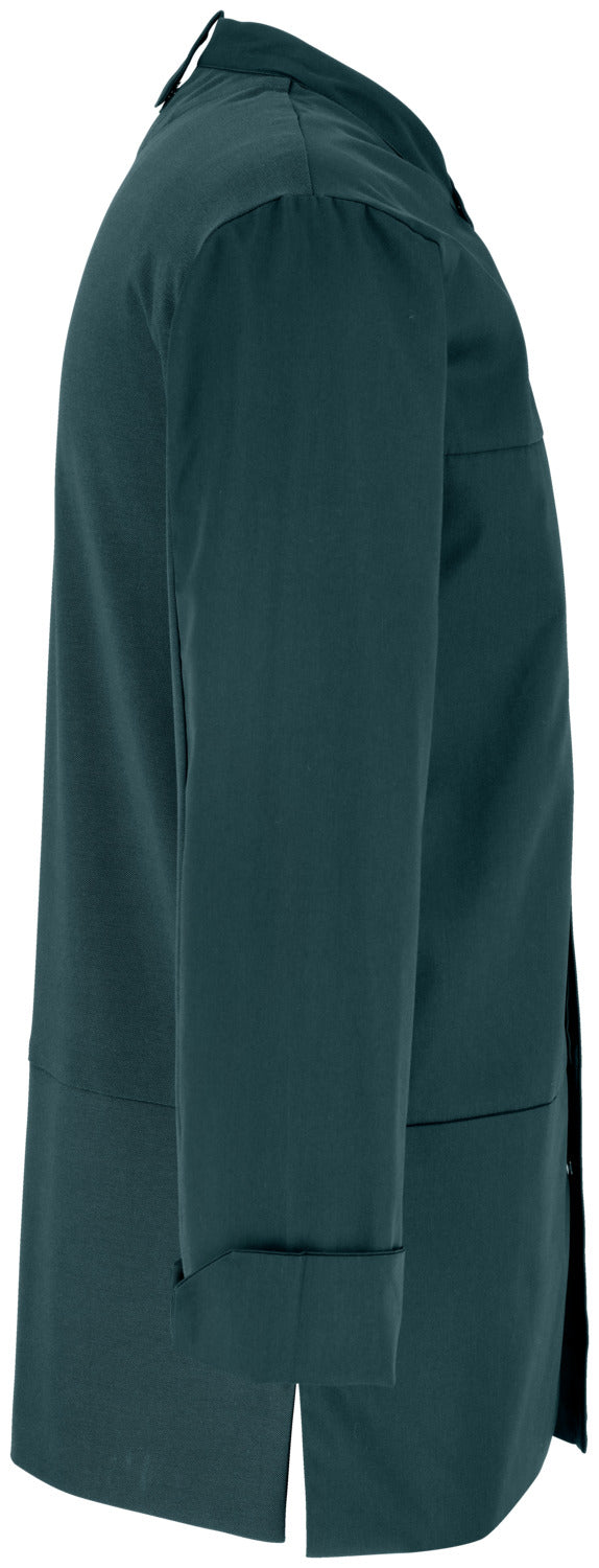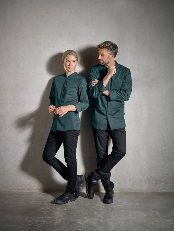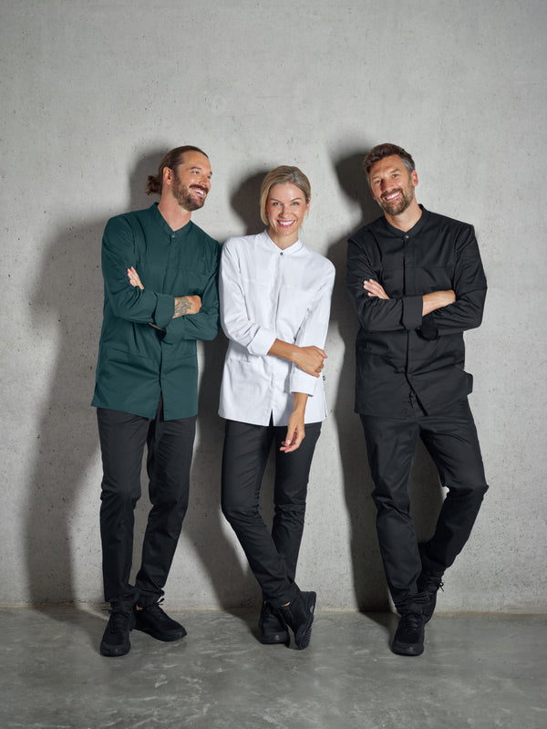 Elegancka bluza męska dla kucharzy, kelnerów oraz pracowników, obsługi, baru i hotelu, wykonana z wyjątkowo lekkiego i oddychającego materiału. Z płaską, wąską stójką, zapięciem na zatrzaski na środku i dwuczęściową kieszenią na ramieniu. Z wpuszczaną kieszenią na piersi, dwiema kolejnymi praktycznymi kieszeniami u dołu i pętelką na fartuch z tyłu szyi. Rękawy zakończone klasycznym, wywijanym mankietem. Cała tylna część, a także pachy, wykonane z oddychającego i elastycznego materiału piqué, który zapewnia smukłe i niezwykle wygodne dopasowanie. Lekko dopasowany krój. Długość pleców: 80 cm w rozmiarze 50. 65% poliester, 35% bawełna. 150 g/m². Pranie w 60°