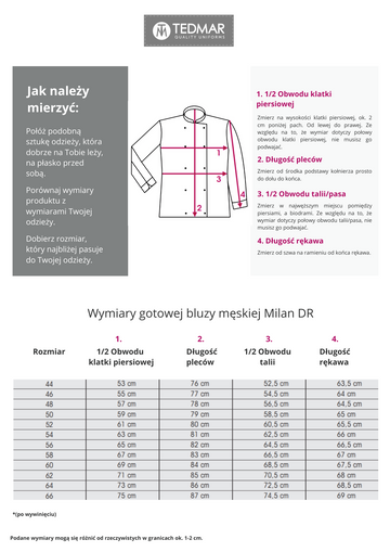 Męska bluza kucharska w wielu atrakcyjnych kolorach. Ta lekka mieszanka poliestru z bawełną zapewnia wyjątkowy komfort użytkowania. Podwójna kieszeń na rękawie. Zapięcie na 10 guzików w kolorze bluzy wraz listwą w zestawie. Łatwa do prania i prasowania. Wersja męska dostępna z długim lub krótkim rękawem. Skład; 65 % poliester, 35 % bawełna. Gramatura: 160 g/m². Pranie 60°C. Dł. po plecach: 78 cm w rozmiarze 50.