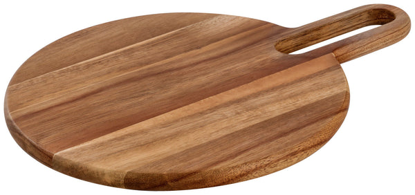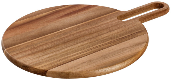 Modna deska do serwowania wykonana z olejowanego drewna akacjowego z uchwytem do przenoszenia i bardzo szerokim otworem do zawieszania. Nie nadaje się do mycia w zmywarce. Bezpieczna dla żywności.