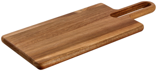 Modna deska do serwowania wykonana z olejowanego drewna akacjowego z uchwytem do przenoszenia i bardzo szerokim otworem do zawieszania. Nie można myć w zmywarce. Bezpieczna dla żywności.