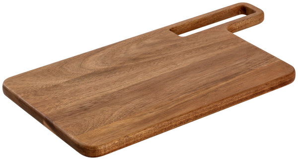 Modna deska do serwowania wykonana z olejowanego drewna akacjowego z bocznym uchwytem i bardzo szerokim otworem do zawieszania (12,5 x 3 cm) w kształcie prostokąta. Nie nadaje się do mycia w zmywarce. Bezpieczna dla żywności.