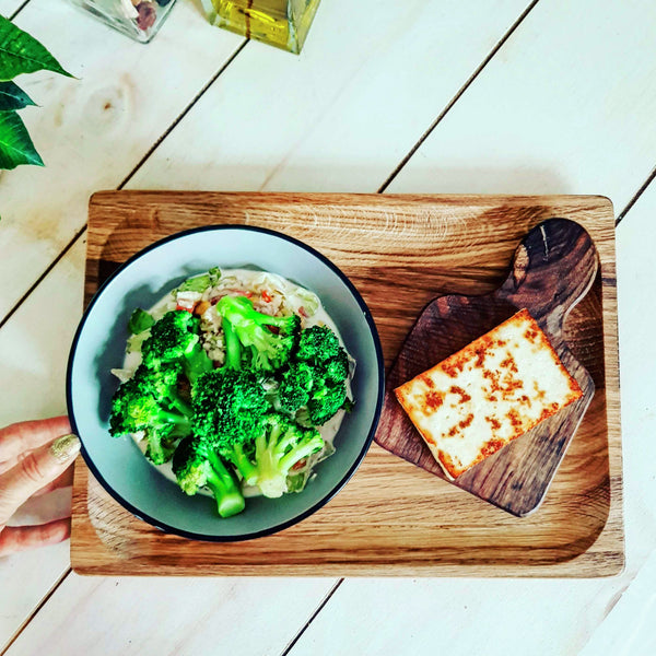 Deska z olejowanego dębu z zagłębieniem (dł. x szer. 33,5 x 23,5 cm). Bezpieczna w kontakcie z żywnością. Nie nadaje się do zmywarek.