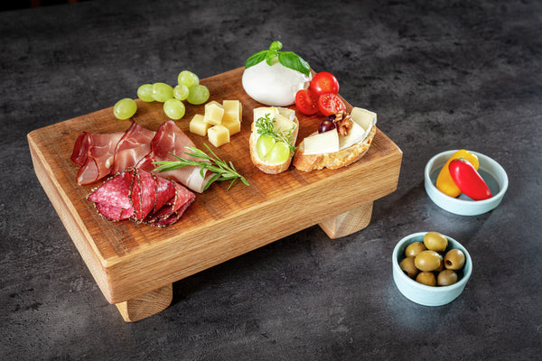 Deska z olejowanego dębu z uchwytem. Dzięki dołączonym nóżkom służy nie tylko jako deska do krojenia, ale także jako ekspozycja przy bufecie. Bezpieczna dla żywności. Nie nadaje się do mycia w zmywarce.