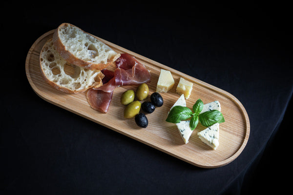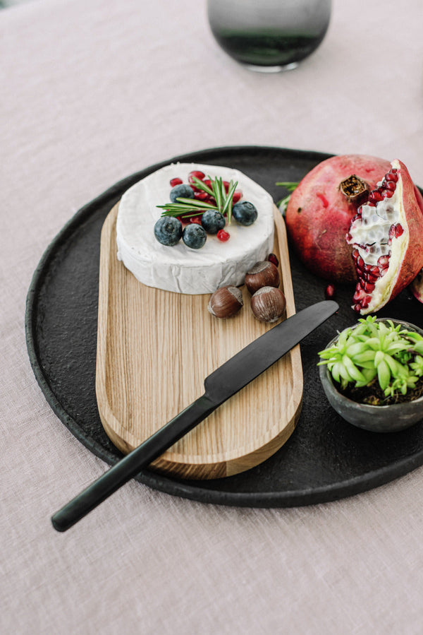 Deska do krojenia wykonana z litego jesionu, olejowana. Z okrągłą krawędzią, może być używana jako deska lub taca. Wykonana ręcznie. Łatwa do czyszczenia. Nie nadaje się do mycia w zmywarce.