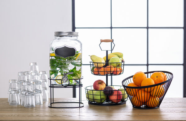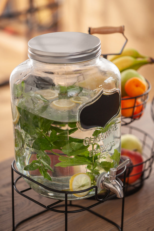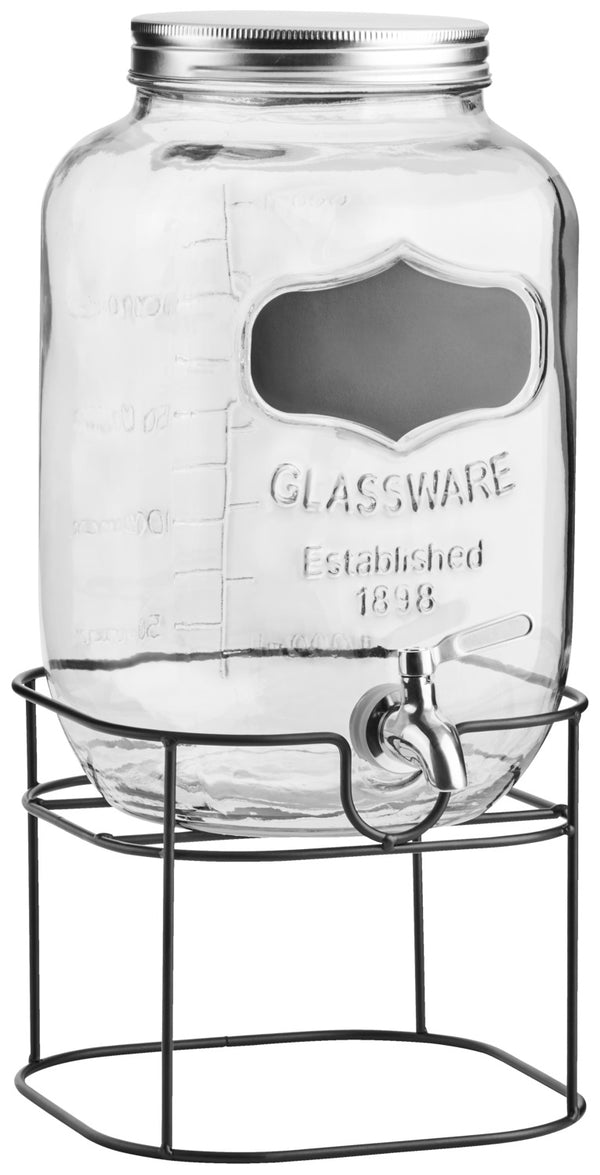 Szklany dozownik do napojów w stylu vintage ze stali nierdzewnej z etykietą do pisania. Kran ułatwiający użytkowanie i dostarczany z praktycznym stojakiem. Duża pojemność 7l. Z linią napełniania i szerokim otworem pokrywy.