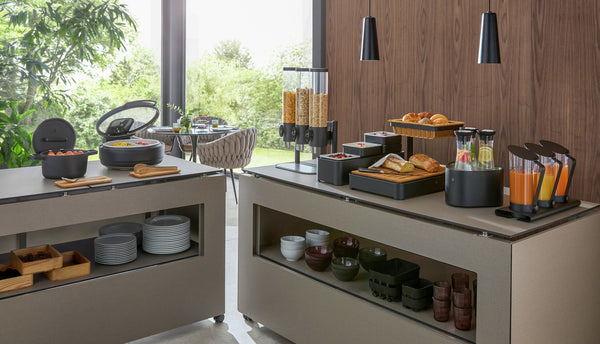 WMF Quadro oferuje pełną gamę produktów do niestandardowych kompozycji bufetowych. Jeden komponent uzupełnia drugi. Seria oferuje ramy, wkłady i tace. Różne powierzchnie i materiały. Wszystko harmonizuje ze sobą wizualnie. I wszystko współgra funkcjonalnie - w wysokiej jakości wykonaniu WMF. Niezależnie od tego, czy jest to śniadanie, lunch, deser czy kolacja w formie bufetu: WMF Quadro sprawia, że montaż jest wyjątkowo łatwy. Poszczególne moduły i kombinacje są gotowe do użycia w zaledwie kilku prostych krokach i można je natychmiast złożyć. Zestaw do soków / płatków śniadaniowych w kolorze czarnym, odpowiedni do bufetu WMF Quadro, składający się z ramy i 3 słoików z pokrywkami, o pojemności 2 litrów każdy, do soków, mleka lub płatków śniadaniowych.