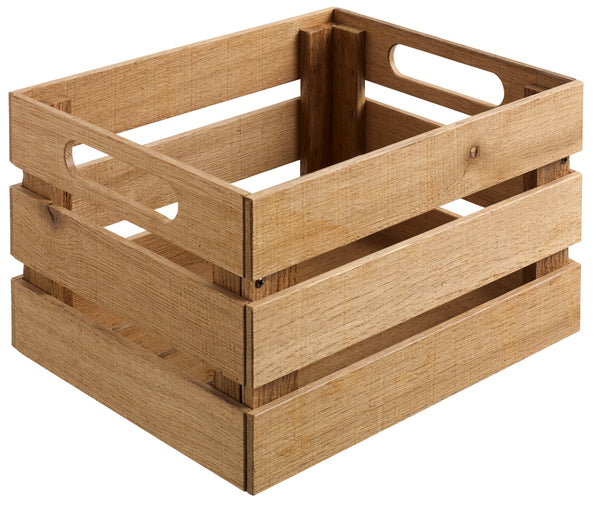 Drewniana skrzynia do użytku wewnątrz pomieszczeń. z bocznymi uchwytami wykonana z litego dębu, lakierowana na kolor naturalny lub czarny. Modny wygląd vintage. Łatwa w montażu, dostarczana w stanie rozmontowanym. Dostępna w różnych rozmiarach. Skrzynie o wymiarach 55,2 x 34,7 cm (dł. x szer.) odpowiednie do pojemników GN 1/1, 1/2 i 1/3. Bezpieczne dla żywności. Możliwość sztaplowania. Nie można myć w zmywarce.