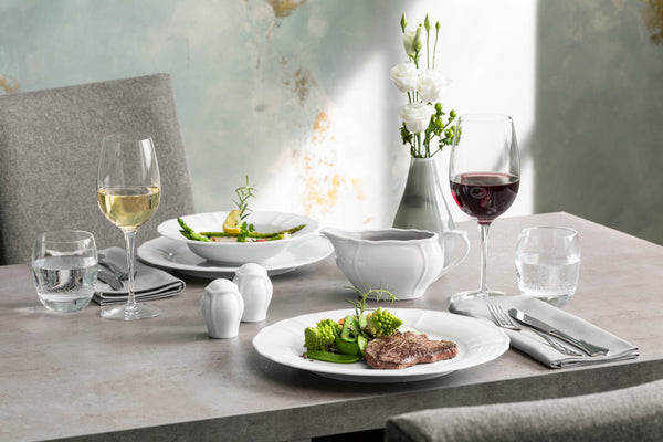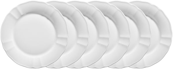 Talerze z białej porcelany. Subtelny relief i figlarne dekoracyjne krawędzie tworzą nostalgiczne akcenty. Można myć w zmywarce i używać w kuchence mikrofalowej.