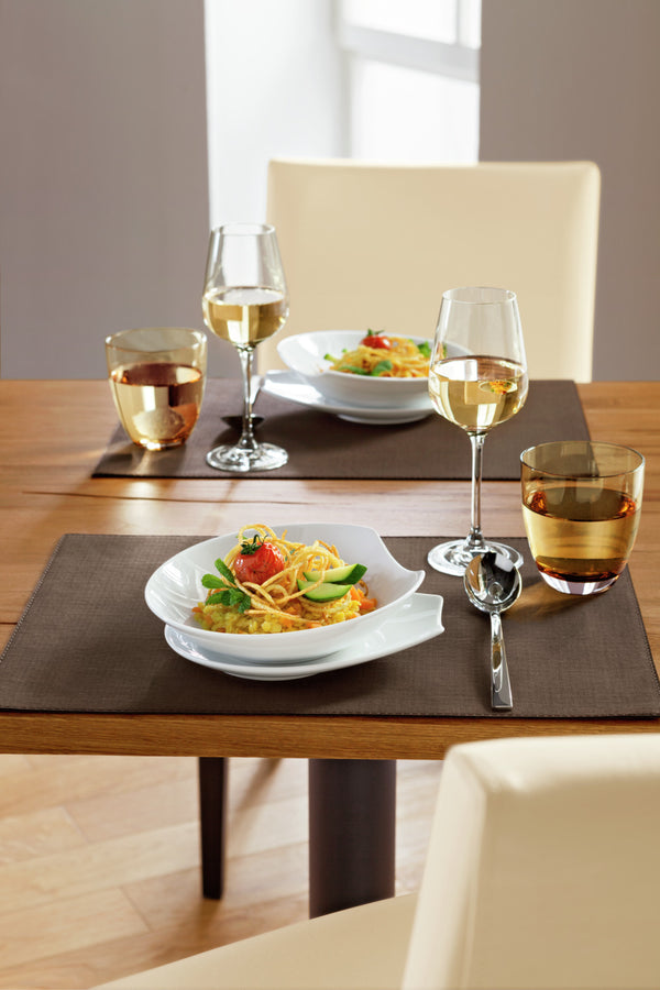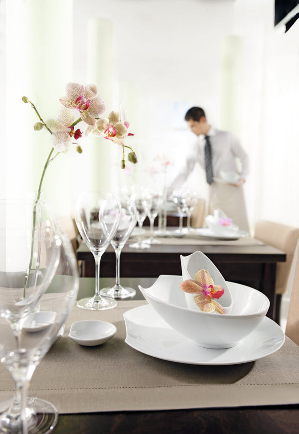 Białe porcelanowe talerze z wycięciem na krawędzi. Można myć w zmywarce i używać w kuchence mikrofalowej.