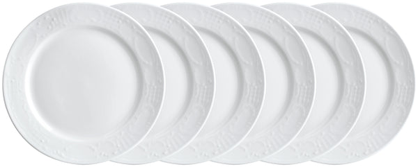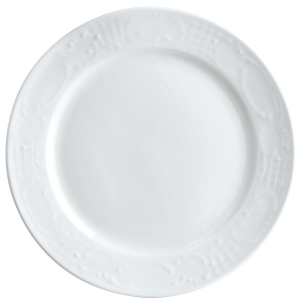 Biały porcelanowy talerz z eleganckim reliefem. Można myć w zmywarce i używać w kuchence mikrofalowej.