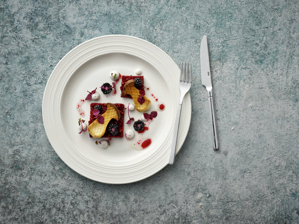 Talerz z porcelany bone china z reliefem w kolorze kremowym. Nowoczesny design. Wysoka odporność. Olśniewające szkliwo. Można myć w zmywarce i używać w kuchence mikrofalowej.