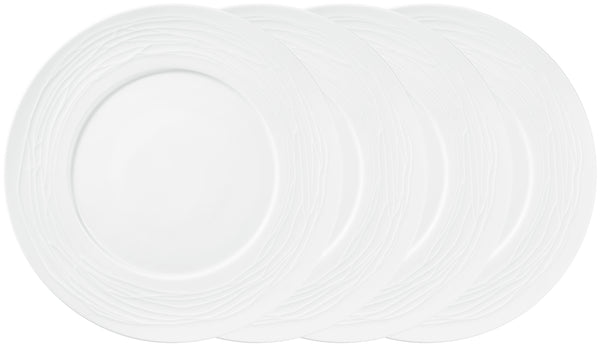 Talerz z białej porcelany ozdobiony ekstrawaganckim reliefem na krawędzi talerza. Można myć w zmywarce i używać w kuchence mikrofalowej.