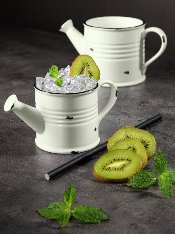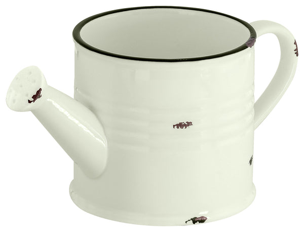 Porcelanowy dzbanek w stylu retro, przypominający konewkę. Bez otworów: nie nadaje się do wylewania. Z czarną obwódką i ozdobnymi wyszczerbieniami na krawędziach i powierzchniach zewnętrznych. Można myć w zmywarce i używać w kuchence mikrofalowej.