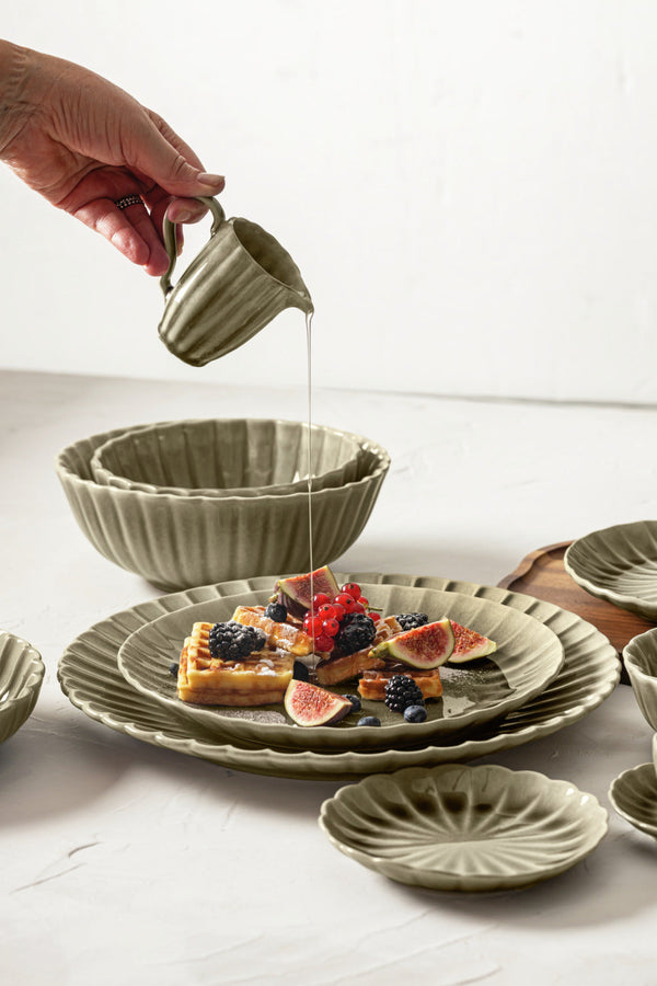 Kolorowy porcelanowy dzbanek w pięknym kształcie kwiatu. Można myć w zmywarce i używać w kuchence mikrofalowej.
