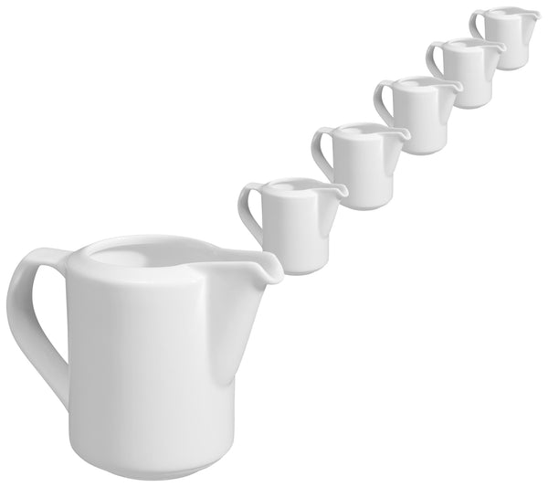 Dzbanek z białej porcelany. Prosty, ponadczasowy kształt. Można myć w zmywarce i używać w kuchence mikrofalowej.