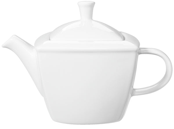 Biały imbryk z porcelanową pokrywką o kwadratowej formie. Prosty projekt. Można myć w zmywarce i używać w kuchence mikrofalowej.