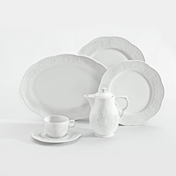 Biały imbryk z porcelanową pokrywką. Z filigranowym reliefem. Można myć w zmywarce i używać w kuchence mikrofalowej.