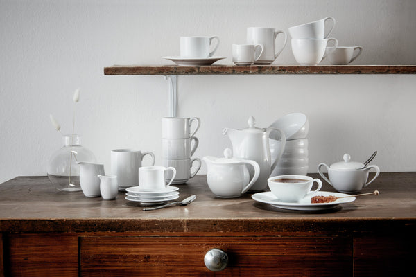 Biały dzbanek do kawy z porcelanową pokrywką. Prosty, elegancki kształt. Z płynnymi przejściami uchwytów. Można myć w zmywarce i używać w kuchence mikrofalowej.