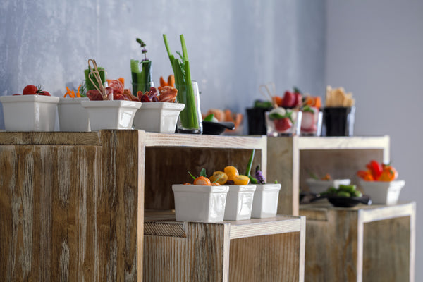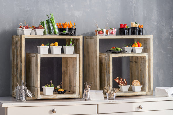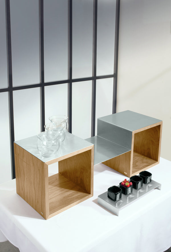 Drewniane kostki do prezentacji potraw na bufetach i stołach. Kostki dębowe i orzechowe fornirowane prawdziwym drewnem, kostki vintage wykonane są z litego drewna. Możliwość rozbudowy o dodatkowe kostki i elementy ze stali nierdzewnej. Łatwa konstrukcja. Dostępne w różnych wersjach.