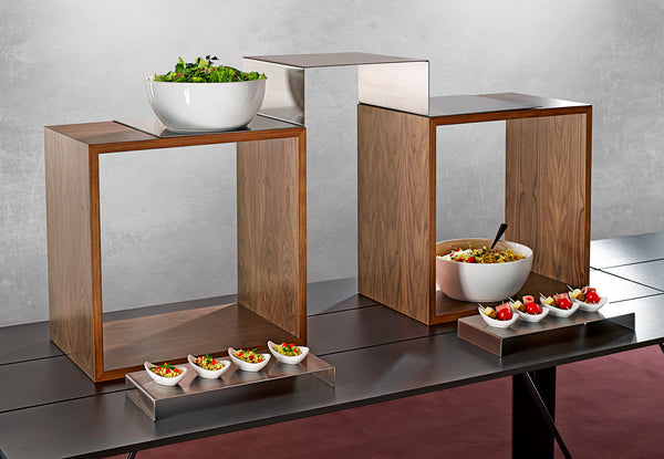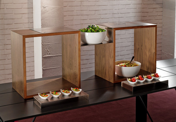 Drewniane kubiki do prezentacji potraw na bufetach i stołach. Kubiki dębowe i orzechowe są fornirowane prawdziwym drewnem. Sfazowane i sklejone. Możliwość rozbudowy w zależności od potrzeb o dodatkowe kubiki i elementy ze stali nierdzewnej. Łatwe w montażu. Dostępne w różnych wersjach.