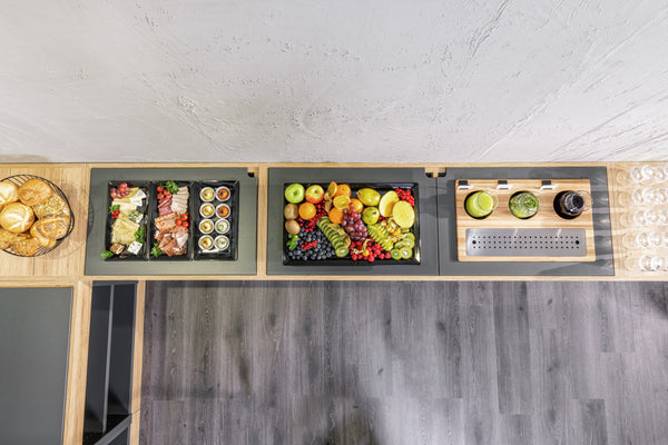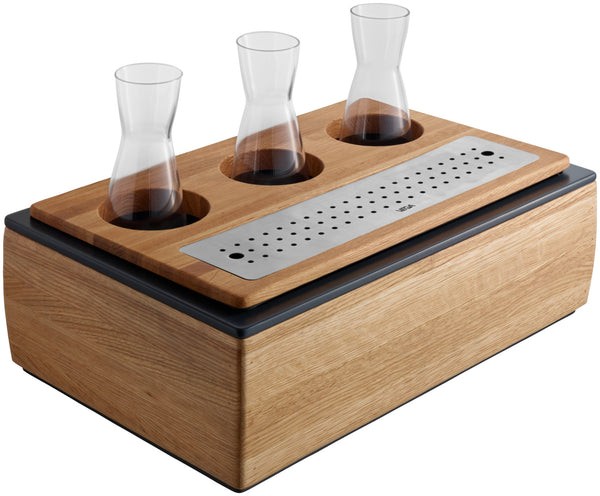 Wkład do pojemników bazowych na karafki wykonany z drewna, odpowiedni na trzy karafki o maksymalnej średnicy 12 cm. Można łączyć tylko z wysokim pojemnikiem podstawowym i czarną misą podstawową o wysokości 1 cm.