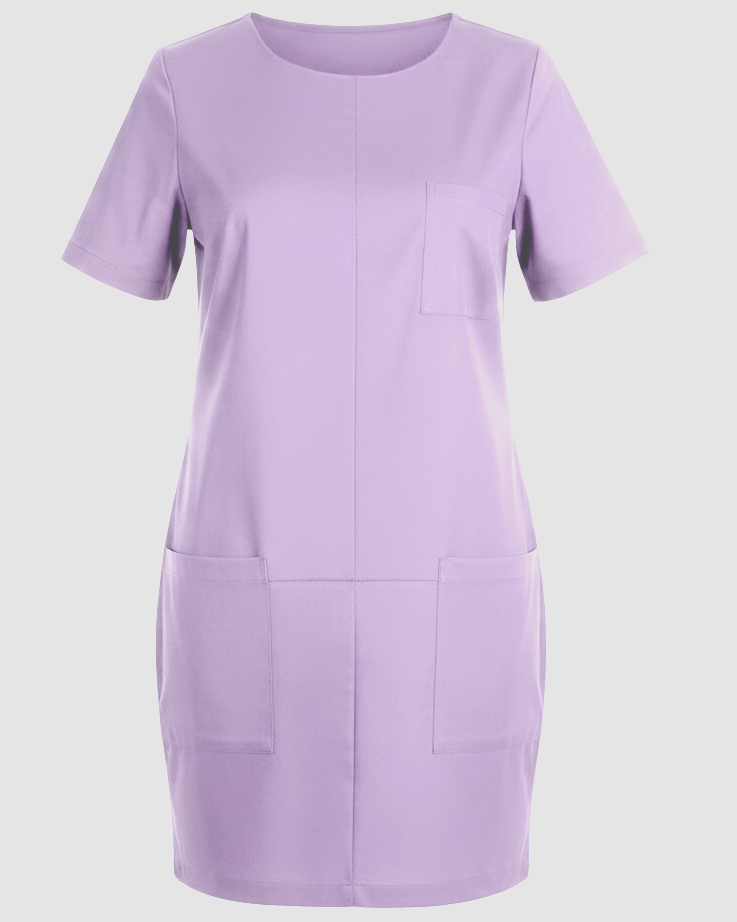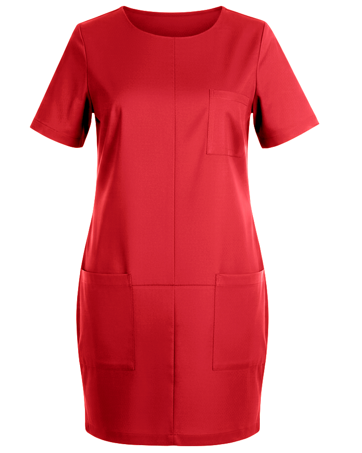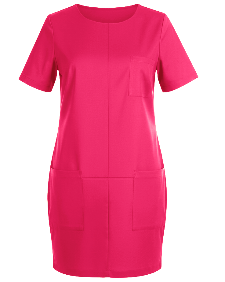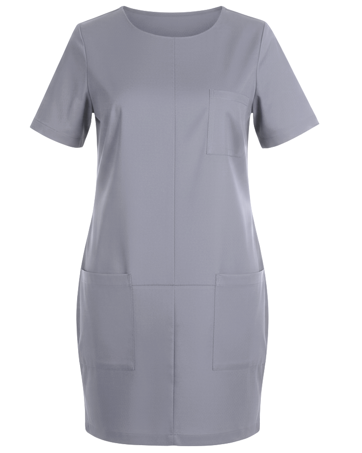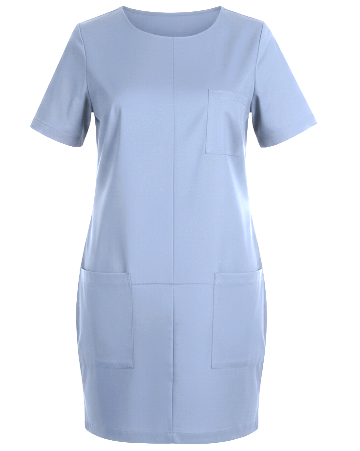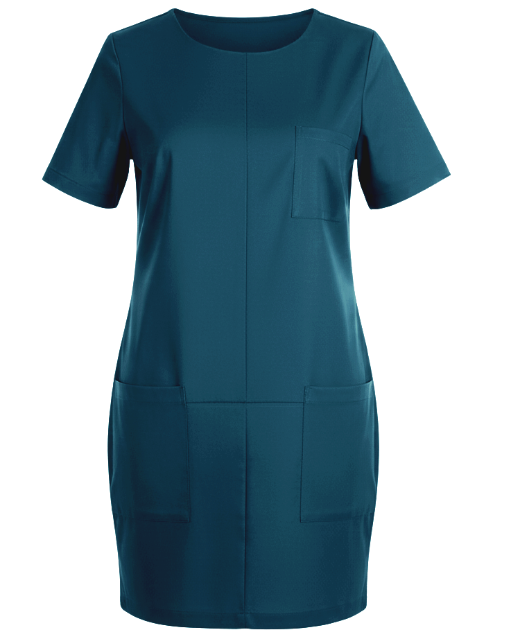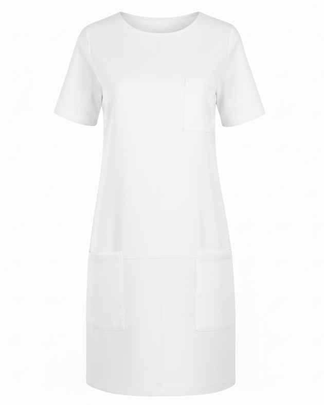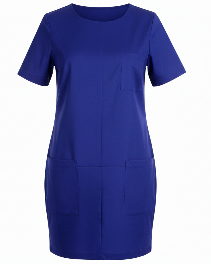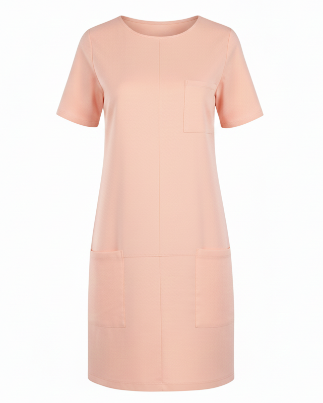 Wygodna sukienka zakładana przez głowę, bez zapięcia. Model taliowany, dopasowany do sylwetki zaszewkami piersiowymi. Posiada 3 praktyczne kieszonki.