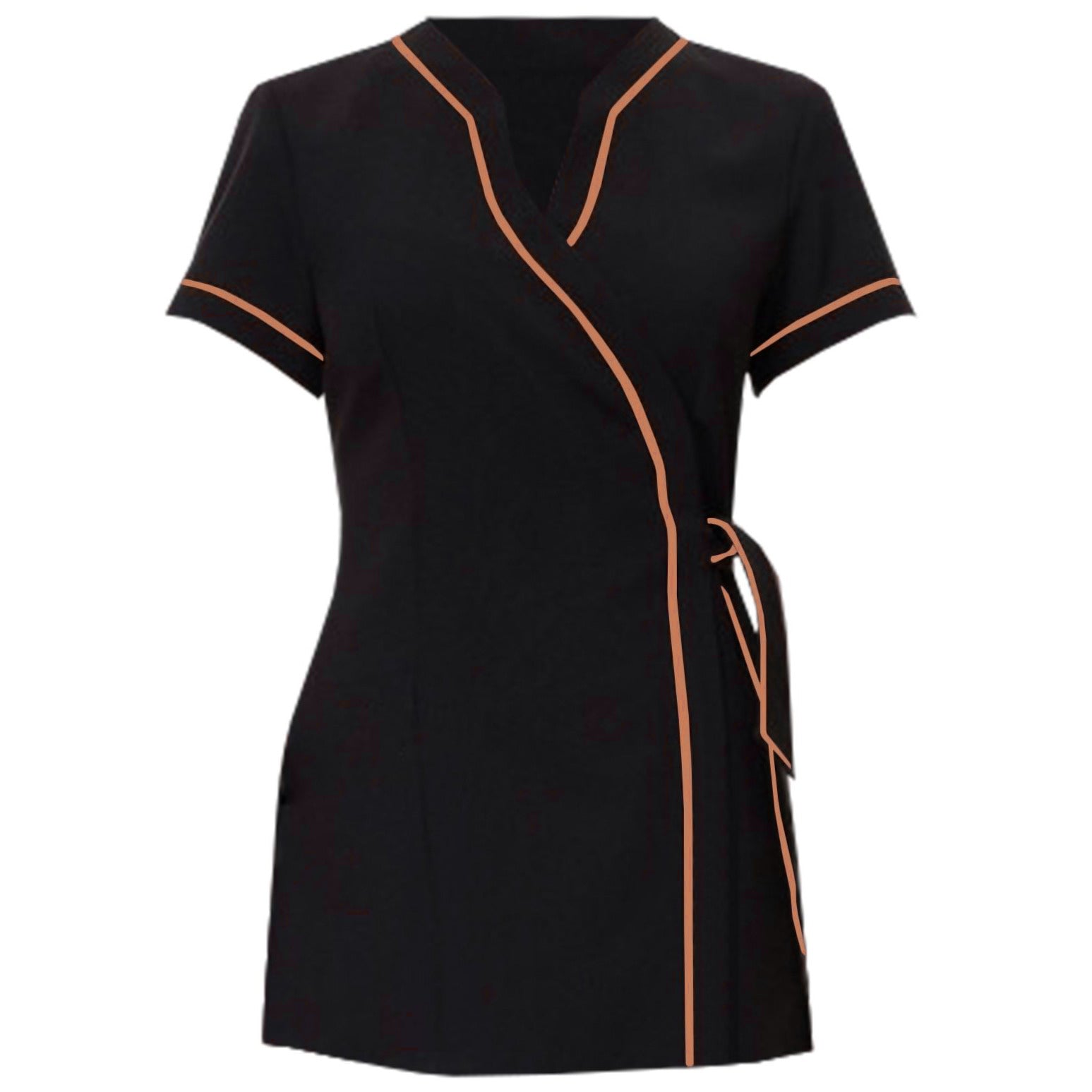 Dopasowany fartuch damski z krótkim rękawem i stylizowanym zachodzącym przodem. Posiada dwie kieszonki, rozcięcia po bokach i zapięcie na suwak. W przodzie, rękawach i dekolcie naszyto kontrastowy sznurek. Zaszewki pionowe dopasowują model do sylwetki.