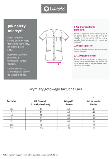 Wygodny fartuch damski zakładany przez głowę, z wiązaniem z tyłu. Model taliowany, dopasowany do sylwetki zaszewkami piersiowymi. Posiada rozcięcia na bokach oraz 2 praktyczne kieszonki.
