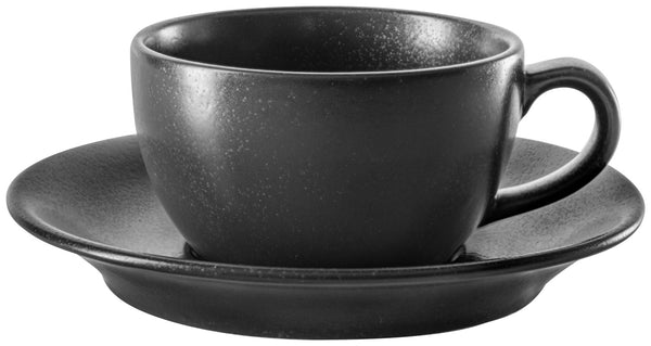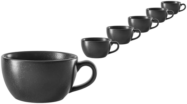 Modna filiżanka do kawy z porcelany, wykończona matową czarną emalią, imitująca ceramikę. Można myć w zmywarce i używać w kuchence mikrofalowej.