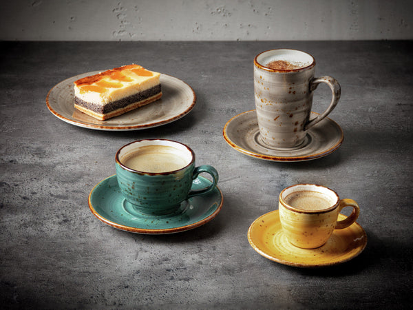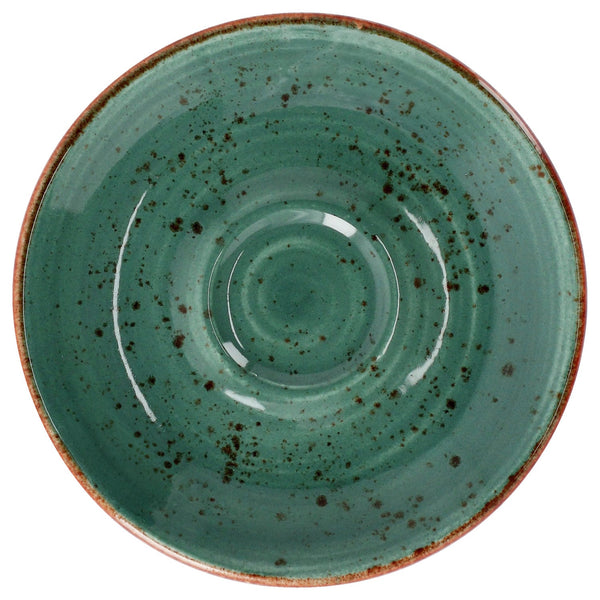 Kolorowy porcelanowy spodek o rustykalnym wyglądzie. Z nieregularnymi plamkami. Każdy egzemplarz jest wyjątkowy. Porcelana premium o wysokiej jakości. Można myć w zmywarce i używać w kuchence mikrofalowej.