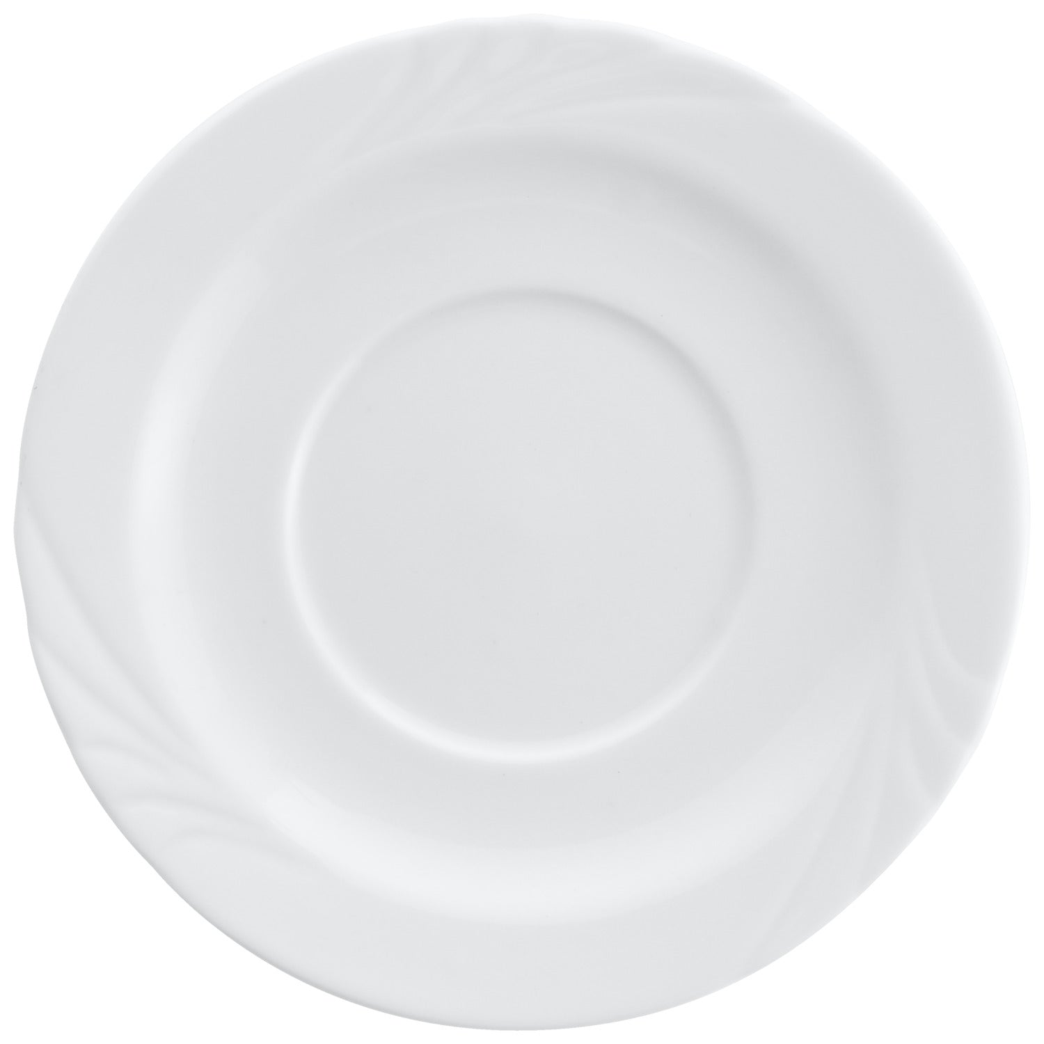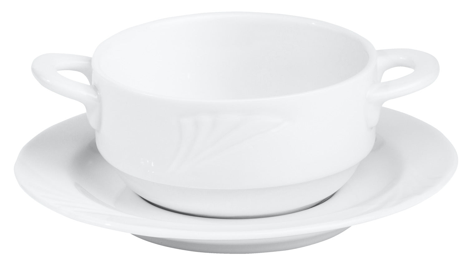 Spodek do bulionówki wykonany z białej porcelany ozdobiony prostym reliefem. Można myć w zmywarce i używać w kuchence mikrofalowej.