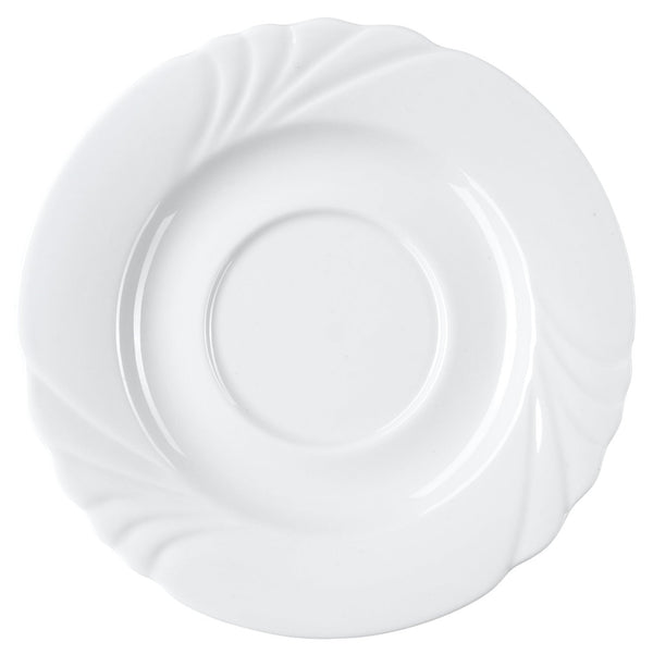 Spodek pod filiżankę do kawy wykonany z białej porcelany. Z prostym reliefem. Można myć w zmywarce i używać w kuchence mikrofalowej.