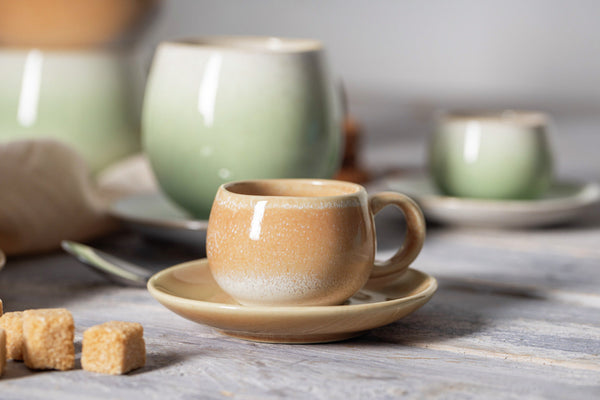 Kolorowy porcelanowy spodek pod filiżankę do kawy. Z gradientem kolorów i nieregularnymi plamkami. Każdy egzemplarz jest wyjątkowy. Można myć w zmywarce i używać w kuchence mikrofalowej.
