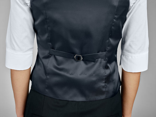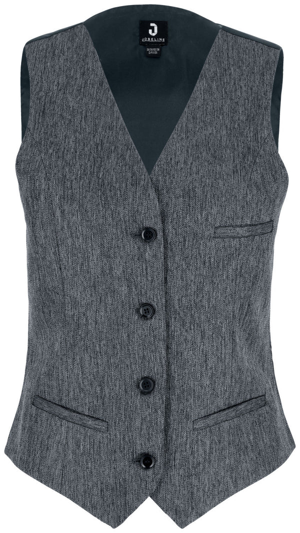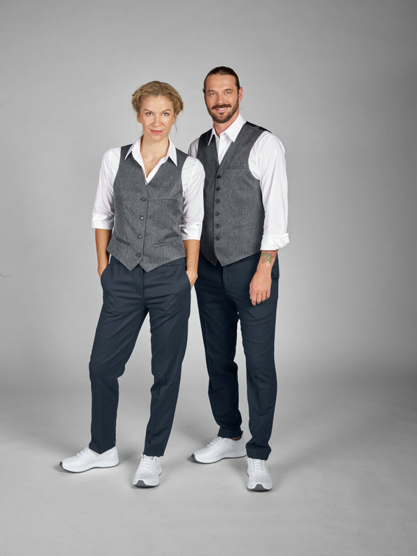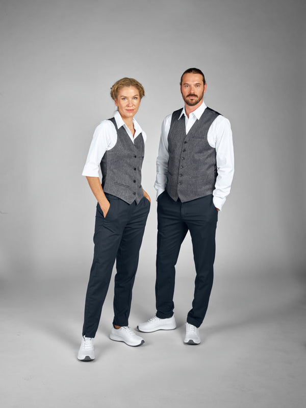 Klasyczna kamizelka damska z nowoczesnym wzorem w jodełkę i klasycznym, gładkim tyłem z tafty. Wykonana z wytrzymałej i trwałej tkaniny poliestrowej. Z regulowanym paskiem z tyłu, trzema kieszeniami w ramce i zapięciem na 4 guziki z przodu. Dopasowany krój. Kamizelka wykonana z wyjątkowo łatwego w pielęgnacji i wytrzymałego materiału. Długość pleców: 52,5 cm w rozmiarze 36. Tkanina 100% poliester. Pranie w 60°.
