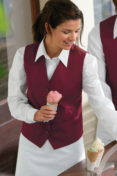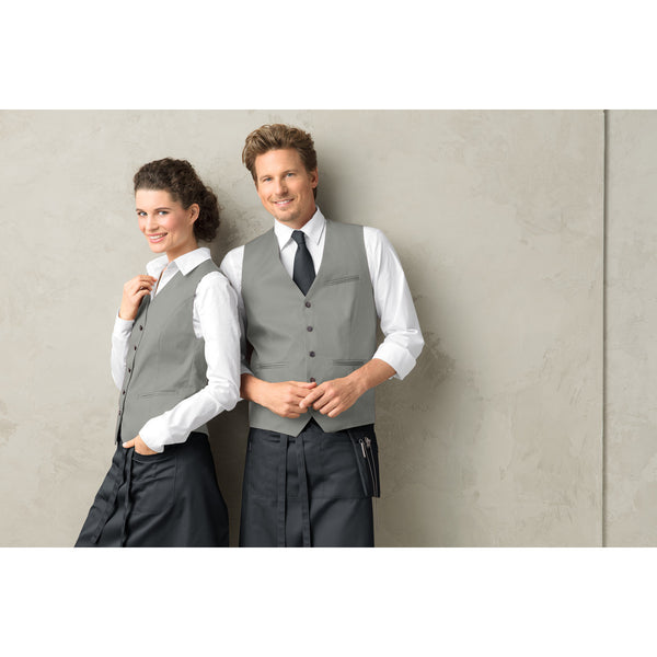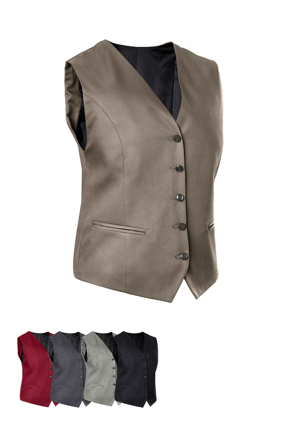 Klasyczna damska kamizelka z regulowanym paskiem z tyłu do dopasowania szerokości w talii, zapięciem na 5 guzików i dwiema kieszeniami z wypustkami. Wygodny krój i pełna podszewka. Szczególnie wytrzymała i łatwa w pielęgnacji tkanina mieszana. 65% poliester, 35% bawełna. Pranie w 60°. Długość pleców: 56 cm w rozmiarze 36