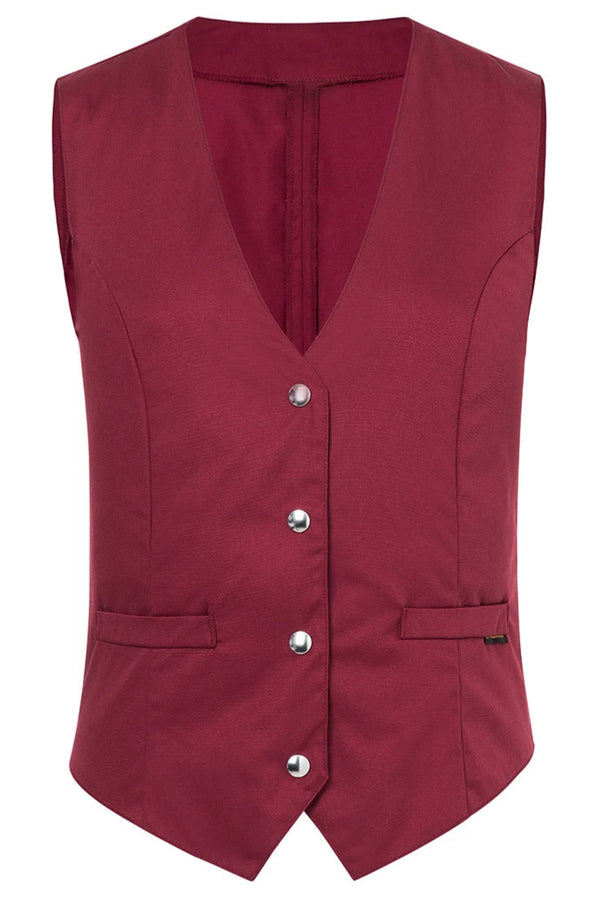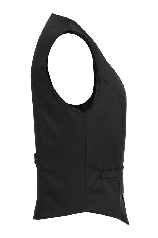 Elegancka kamizelka damska o dopasowanym kroju z regulowanym paskiem z tyłu. Kamizelkę wykonano z dekatyzowanej tkaniny, aby zapobiec kurczeniu się podczas prania oraz wykończono apreturą. Dzięki tym właściwościom tkaniny mieszanej kamizelka jest łatwa w pielęgnacji, pięknie się prezentuje i wyróżnia trwałym kolorem.